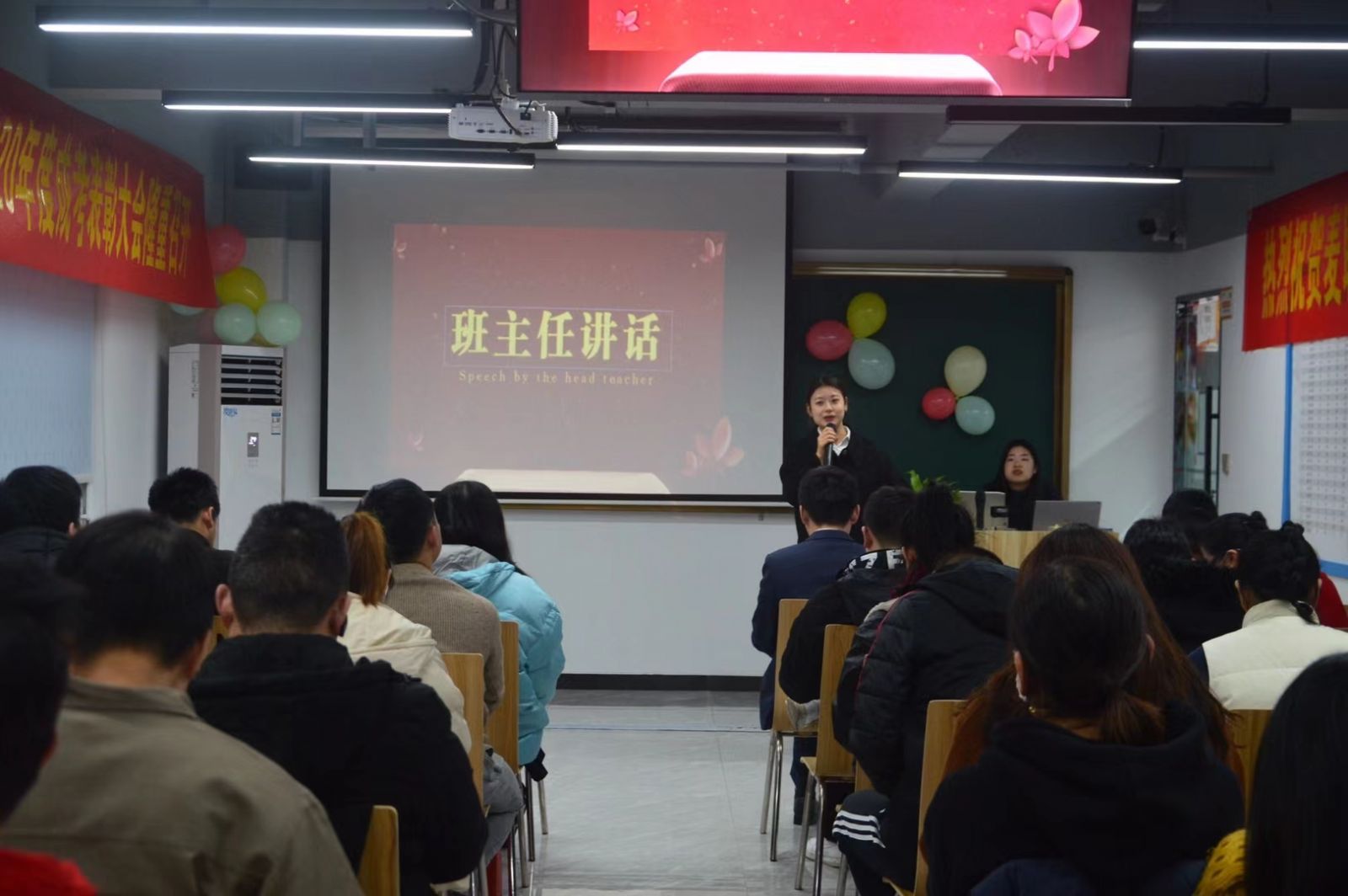 入学庆功会上,不仅有班主任入学说明讲解,还有高分学霸分享自己的学习考试经验技巧,帮助提高同学们接下来的学习。